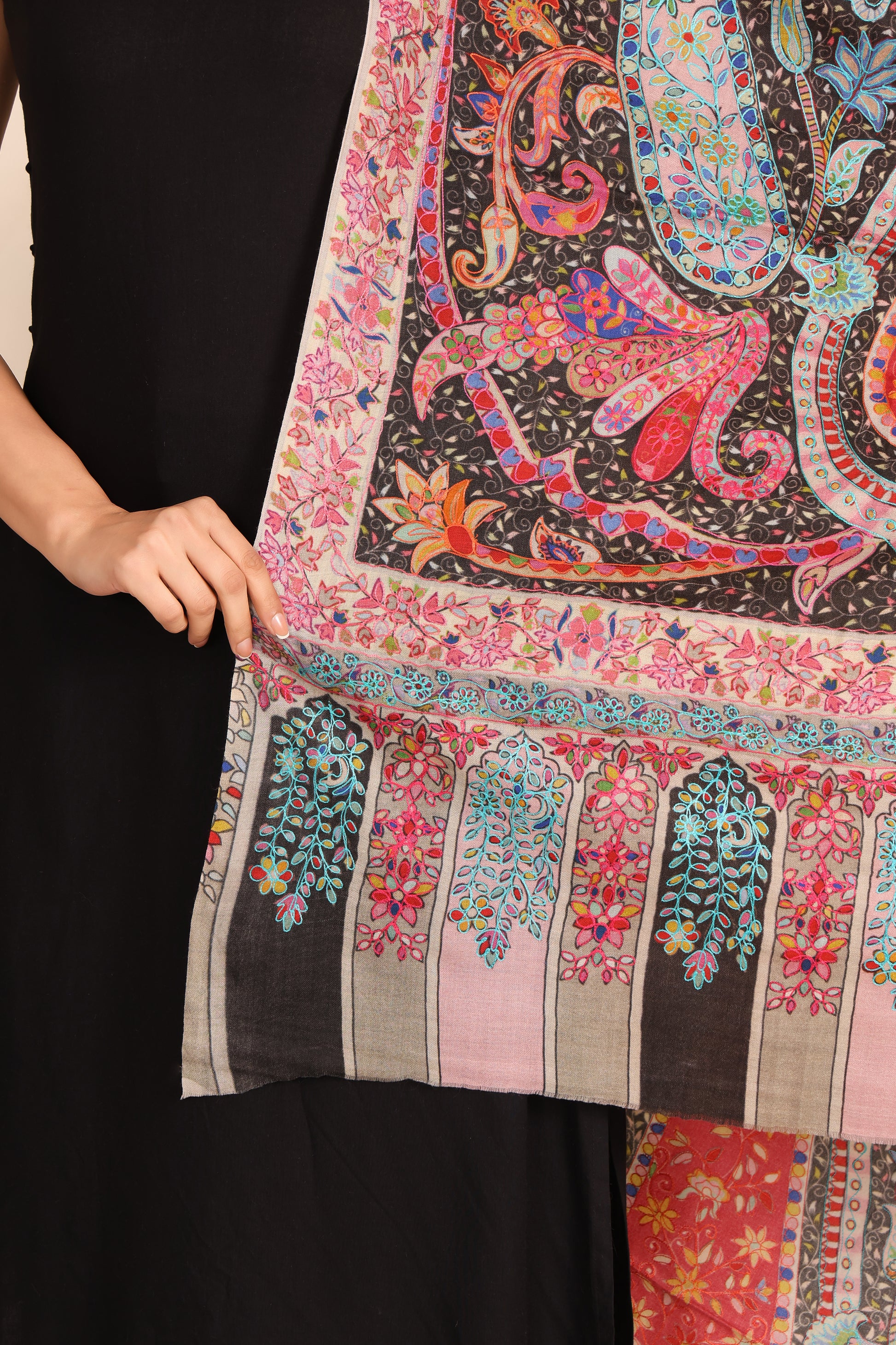 يجمع شال كلامكاري باشمينا بلند – برينت ستوري بين التقاليد الفنية والراحة اليومية، مما يجعله قطعة متعددة الاستخدامات لإطلالة معبرة وبسيطة.